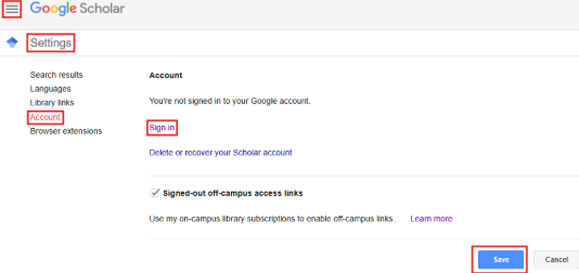 - Or go to the ‘hamburger’ icon at top left of Google Scholar and select ‘Settings’. Click on ‘Account’. Click on ‘Sign in’ and follow the prompts. Click Save. Do this in each browser you use for Google Scholar.